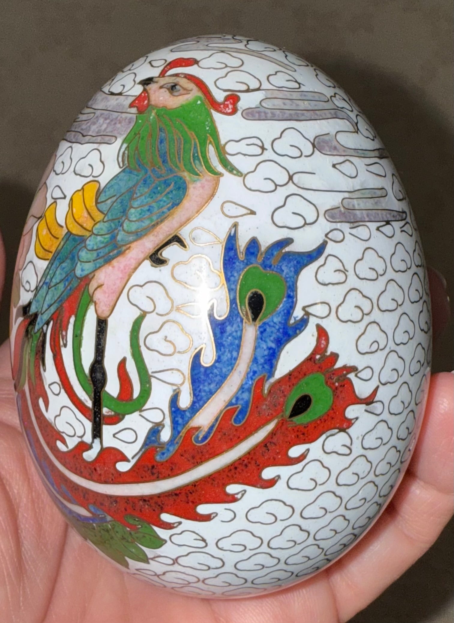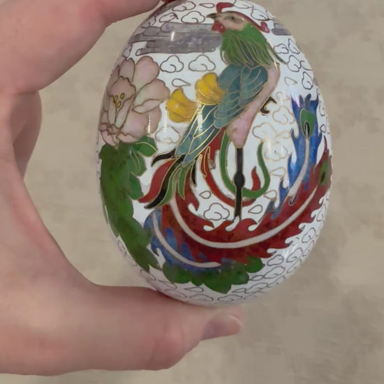 Decorative cloisonné eggs of this type were produced in China primarily during the late 20th century, reflecting a revival of classical motifs and export-quality craftsmanship inspired by earlier Qing dynasty precedents. While not imperial in origin, examples such as this were created for collectors and connoisseurs of Asian decorative arts, and are now appreciated for their cultural symbolism, aesthetic balance, and artisanal quality.