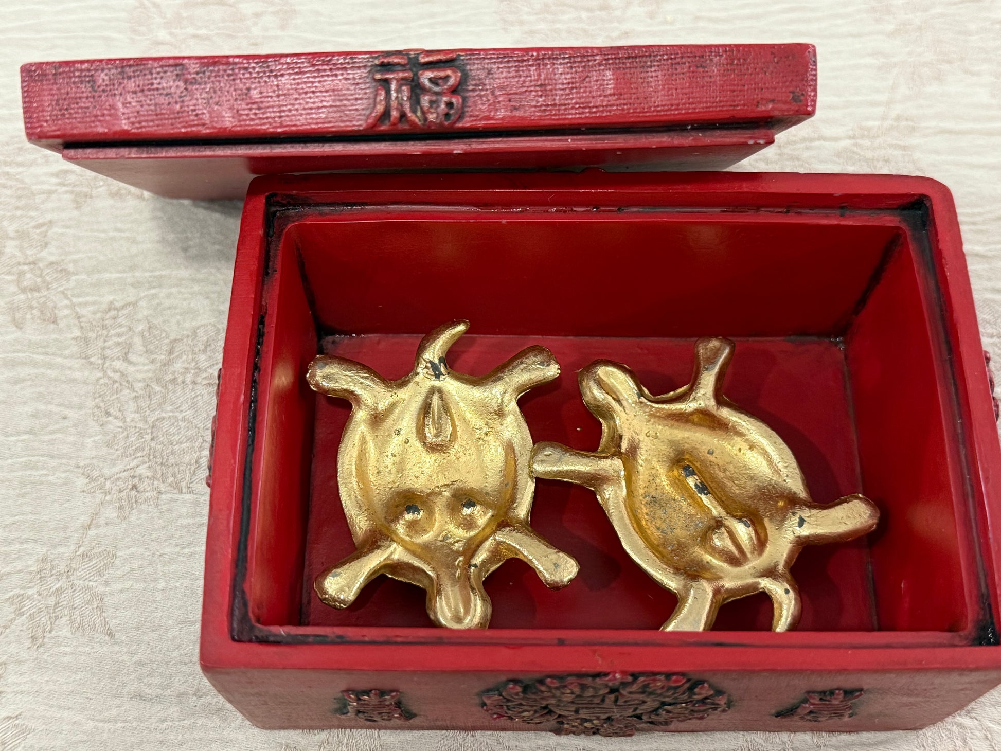 Gold Plated Turtle Figurines – Feng Shui Male & Female Pair in Red Chinese Longevity Box – Prosperity Decor Gift