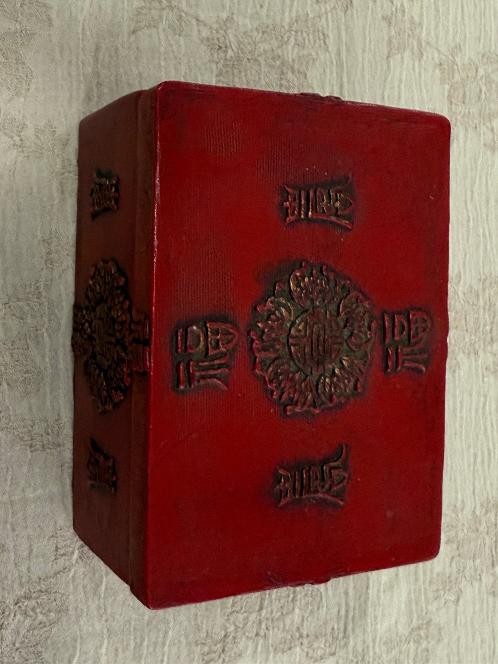 The box features raised longevity symbols and traditional Chinese-style motifs, finished in a deep red tone — a color associated with luck and prosperity.