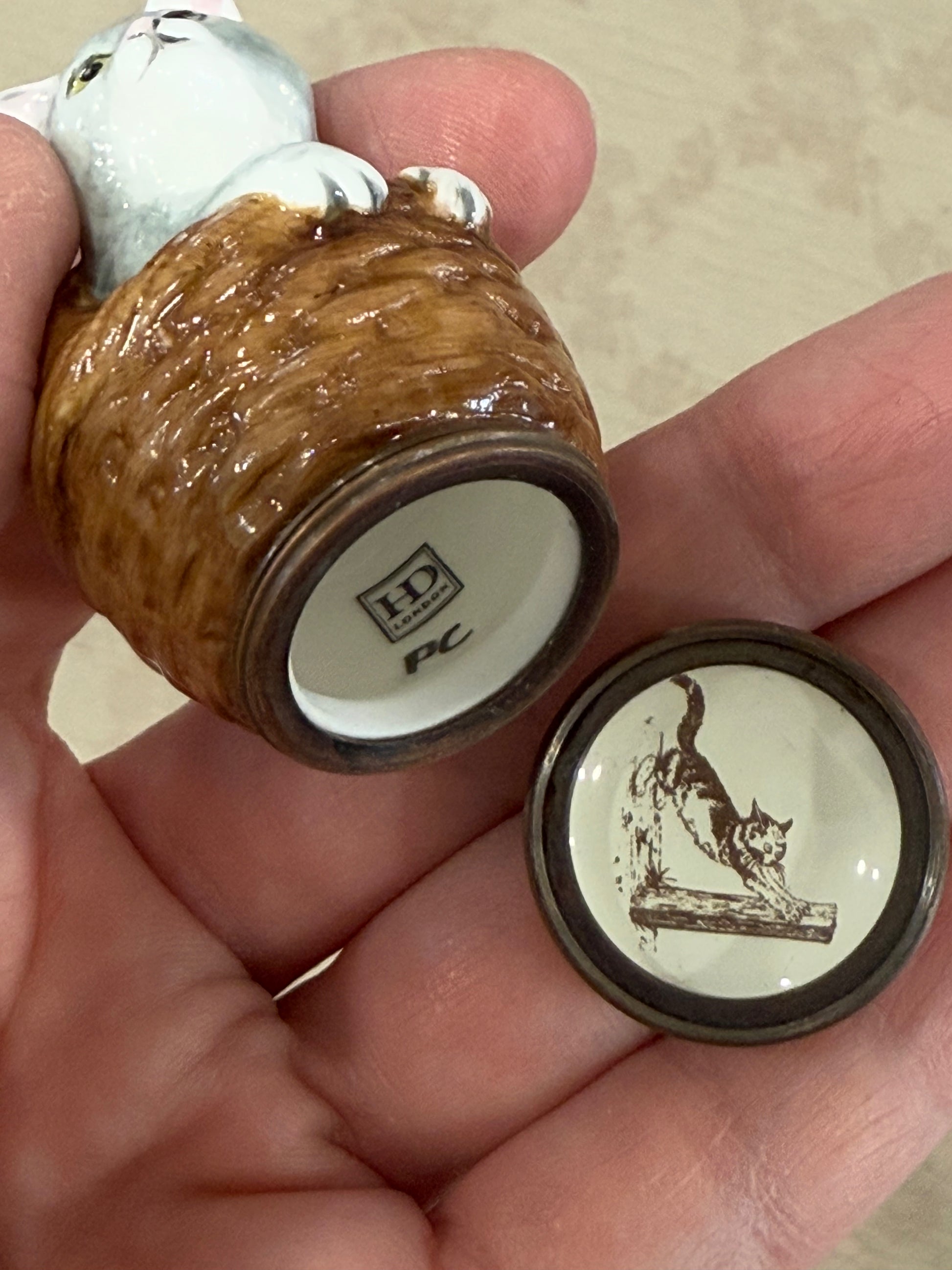 Measuring approximately 2 inches tall, this petite trinket box includes a secure screw-top closure, making it perfect for holding rings, small keepsakes, or treasured mementos. Created in the early 2000s, this is an authentic original Halcyon Days piece, ideal for collectors, cat lovers, and those who appreciate refined decorative accents.