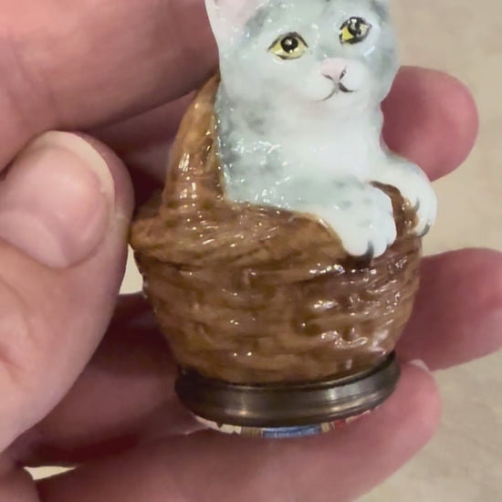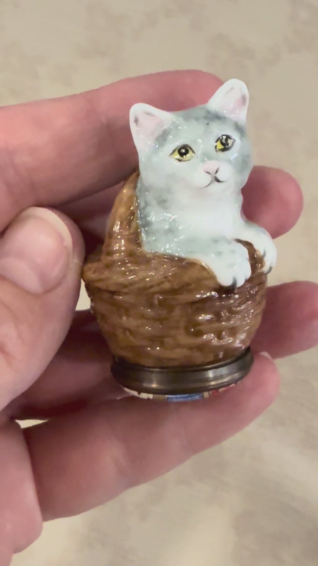 Bring timeless charm and fine British craftsmanship into your space with this Halcyon Days enamel trinket box, featuring an adorable gray kitten nestled sweetly in a basket. Handcrafted with exceptional attention to detail, this miniature collectible showcases the signature glossy enamel finish Halcyon Days is known for worldwide.