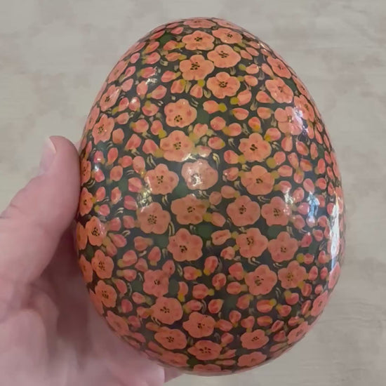 A richly decorative hand-painted papier-mâché egg crafted in the traditional Kashmiri style, this piece features an all-over floral motif rendered in warm coral, peach, and gold tones against a deep black ground. The dense, rhythmic patterning and lacquered finish reflect centuries-old artisan techniques from the Kashmir region, where papier-mâché objects were prized for both beauty and symbolism.