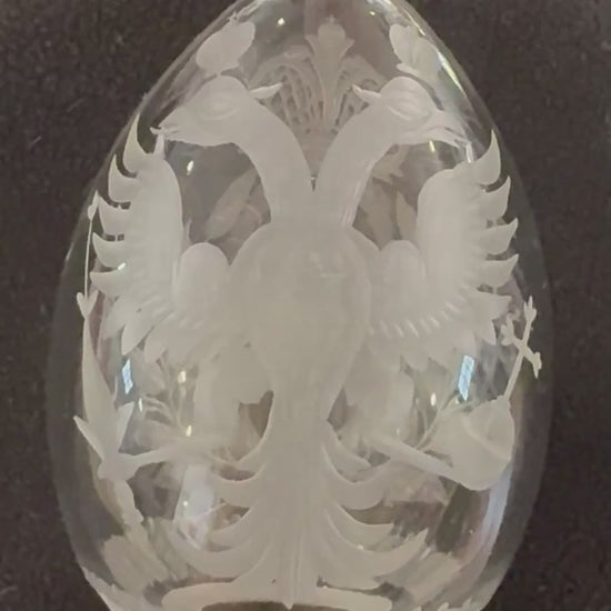 This exceptional antique Russian glass Easter egg, dating to circa 1770, is a rare and captivating example of 18th-century Imperial craftsmanship. Executed in finely blown, translucent glass, the egg is masterfully engraved on both sides with Imperial Russian insignia, employing a sophisticated see-through optical illusion that is as playful as it is technically impressive.